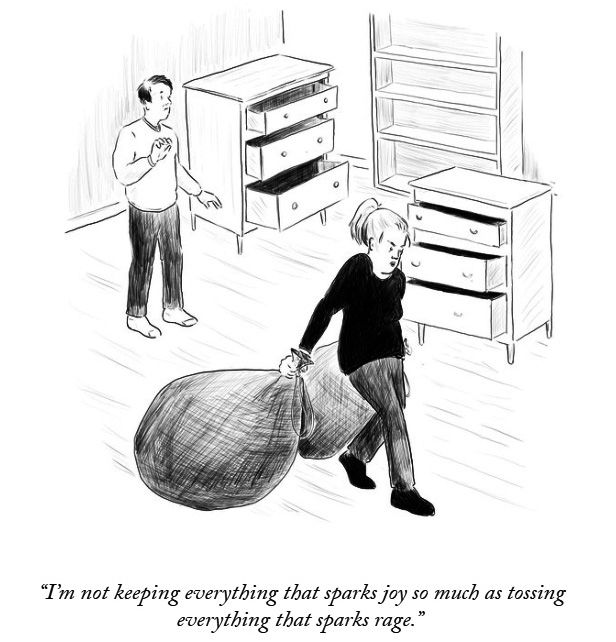 It has occurred to me that some cartoonist will eventually draw Spouse 1 saying to Spouse 2 “You no longer spark joy in me,” but it has also occurred to me that, if Spouse 1 is the woman, it will be yet one more example of (yawn) Hostile Wife Syndrome, upon which mediocre cartooning careers have been built, while, if Spouse 1 were to be the man, it would simply reveal him to be a cad, upon which ditto.