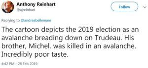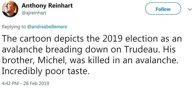 Many took issue with the cartoon, citing the death of Trudeau’s youngest brother – Michel. In 1998, Michel Trudeau was presumed drowned in the Kokanee Lake after [an avalanche swept him] off the Kokanee Glacier Park trail in British Columbia, the CBC reports.