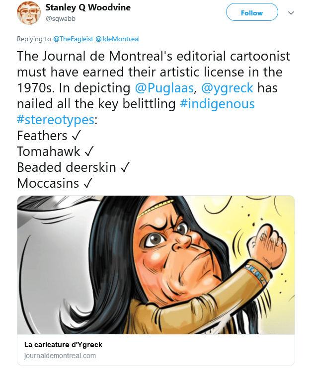 The cartoon depicts Wilson-Raybould in what appears to be incorrect, stereotypical indigenous clothing. According to one commenter, the tomahawk and feathers that she sports in the cartoon are not at all associated with the Kwakwaka’wakw people of which Wilson-Raybould is part.
