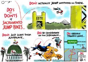 1. I stayed at the Citizen Hotel in Sacramento last year. It’s a nice old building that, though refurbished, still has antique charm, and it’s a block from the state Capitol. The Citizen already leans very heavily into its editorial cartoon identity, with two or three prints hanging in every room and snappy political quotes painted inside the elevators. I love the idea of the Caricature Package, though I can just imagine Ohman grumbling every time he has to drive over to sketch some tourist in the lobby.
