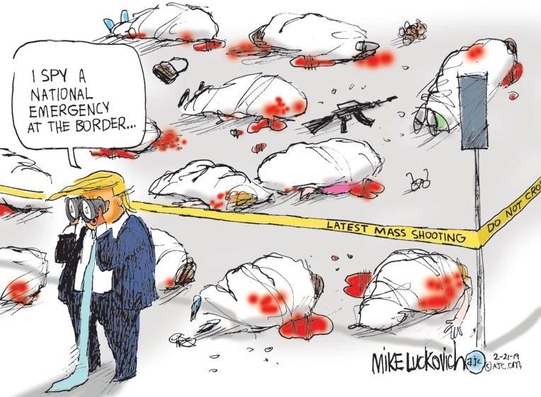 The cartoon depicted President Donald Trump looking through binoculars and saying he detected a problem at the border, while piles of dead bodies from mass shootings covered the ground behind him.