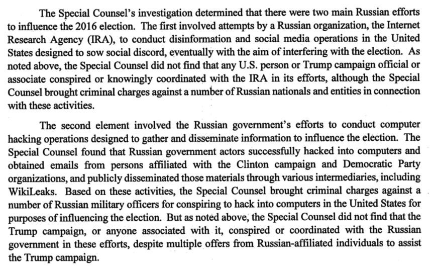 The issue of collaboration is a bit different, and I respect that — according to Barr — Mueller found no evidence of collusion, but I’d like to read exactly what he did find, because it appears somebody is defining “collusion” as active equal-partner conspiracy, rather than allowing it to happen and perhaps encouraging the effort.