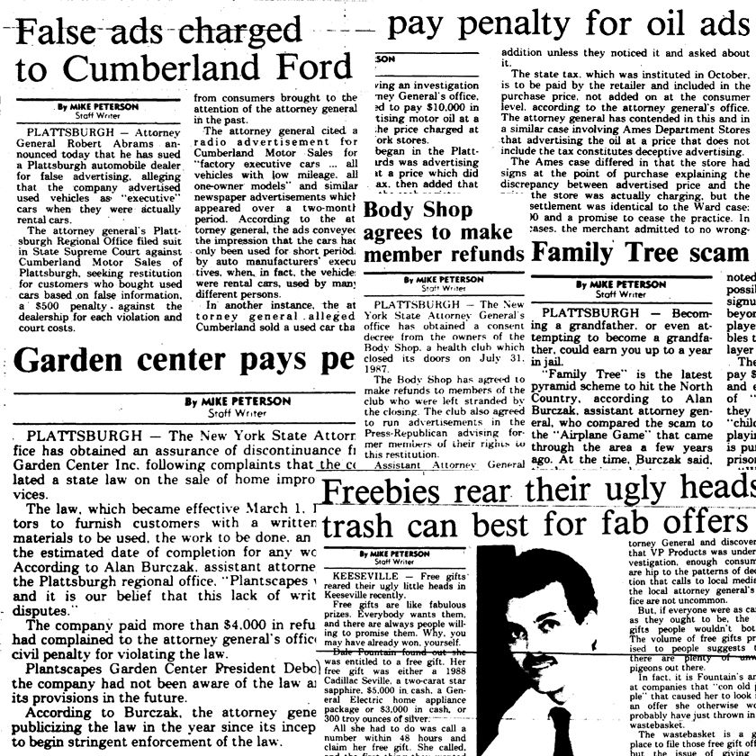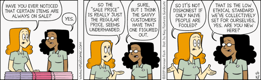 Back in the late 80s, the local assistant AG and I were in regular touch, as he worked to shut down things like phony sales on things that had only been nominally “sold” at full price for a day or two, then put on “X% Off!” permanent pricing.