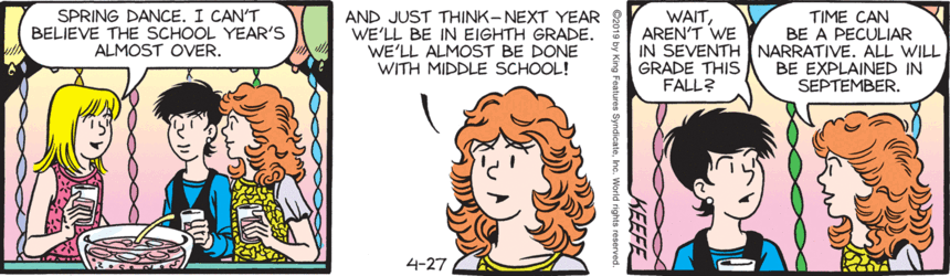 I suppose at some point we’ll have some kind of grand cultural epiphany and we’ll bring back introspective reflections on life’s meaning, like The Man in the Gray Flannel Suit and Only You, Dick Daring! but until then I’ll be watching Sally Forth and anticipating the redemptive rebirth promised by Marciuliano and Keefe, which so far has mostly made the meta humor of the strip take on an atmosphere of prediction which could be entirely in my imagination.