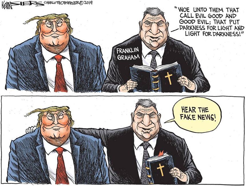 Speaking of cartoonists who combine insight with solid graphics, Kevin Siers does consistently good work, but, in this case, I’m thinking less of that topic than of our earlier one, because, just as I wouldn’t know what America’s Number One Comedy was if I didn’t see the promos on football, I wouldn’t know what Franklin Graham had to say about anything if I didn’t see it in cartoons.