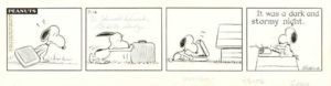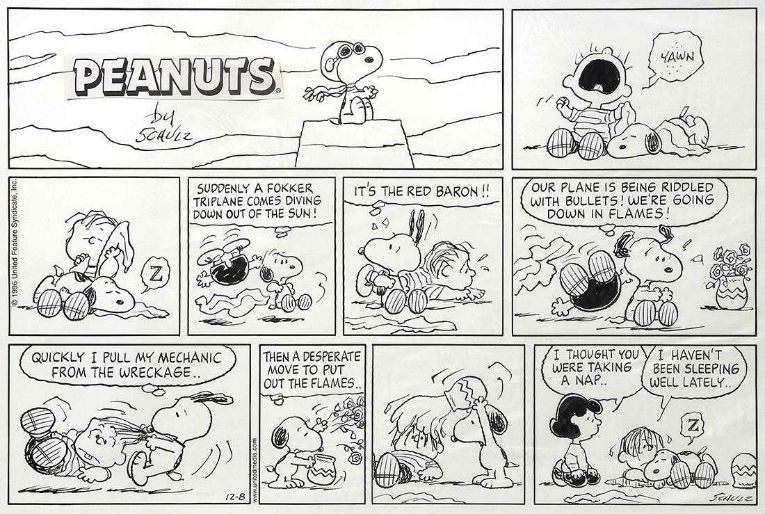 Collectors pay top dollar today to acquire original Peanuts comic strip art, especially for strips showcasing Charlie Brown and Snoopy, such as the 1966 strip detailing a battle between Snoopy and the Red Baron that brought $85,000 in February 2010 at Heritage Auctions