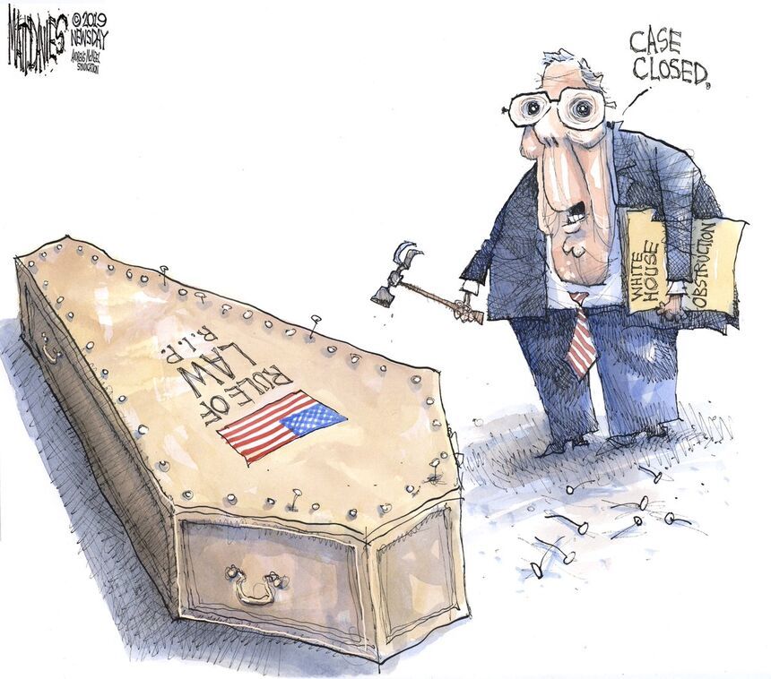 Mitch McConnell’s insistence on putting aside the lies and abuses of power and examples of obstruction in the Mueller Report got different treatment from Davies and Bramhall, and it strikes me as a juxtaposition in which the reader should feel free to choose one or the other.