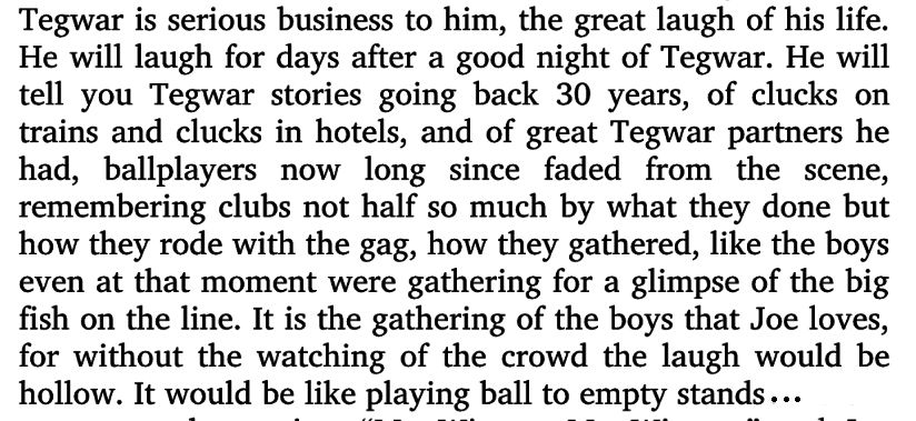 Skip to commentsThe most memorable legacy of Mark Harris’s classic baseball novel, “Bang the Drum Slowly” — which was made into a movie with Michael Moriarity and Robert De Niro — are the games of Tegwar, a ridiculous scam in which the object is to fleece some rookie or star-struck fan who doesn’t realize that “T.E.G.W.A.R.” stands for “The Exciting Game Without Any Rules,” and that the other players are simply making up reasons to take his money.