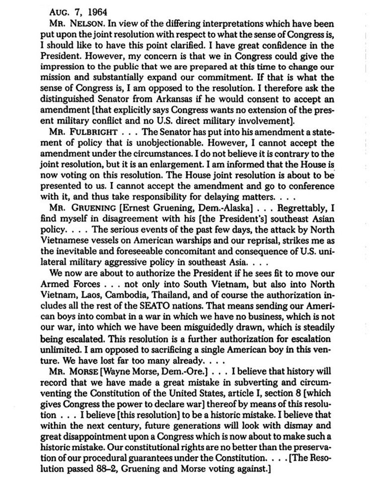 Meanwhile most Americans weren’t born when this exchange took place on the floor of Senate, following dubious reports of North Vietnamese attacks on our ships in the Gulf of Tonkin: