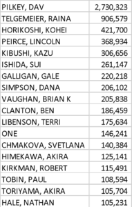 Lincoln Pierce and “Big Nate” is the big star player for Andrews McMeel – there are fifteen different “Big Nate” volumes in the Top 750, summing up to almost 340k copies combined. The best seller (“Silent But Deadly” sells around 84k copies)