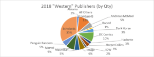 Moving up to #5 largest publisher with Western comics in BookScan Top 750 in 2018 is another of the “big five”: HarperCollins. Harper places twenty books into the Top 750 for a total of 448k copies sold, and $6.5 million. There’s a lot of imprints with the word “Harper” in the title in the Long Tail (Harper, Harper Paperbacks, Harper Teen, Harper Festival, Harper Teen, and so on), and Harper is also Amistad and Blazer & Bray (in the Top 750), and IT books, William Morrow, and Zondervan (out of the Top 750)