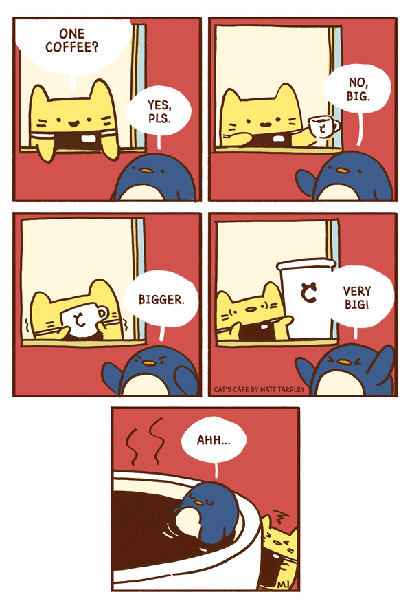 About the comic: Everyone is welcome at Cat’s Café! There is always a seat and someone to talk to. Follow Cat, Penguin, and Rabbit along with a variety of other special animals, form a wonderful place where everyone can feel warm, fuzzy, and accepted.
