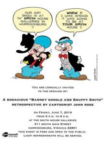 If you are near Harrisonburg Virginia in the month of June be sure to stop at the Smith House Galleries where, from June 7 to June 27 will be a Barney Google and Snuffy Smith by John Rose exhibit.