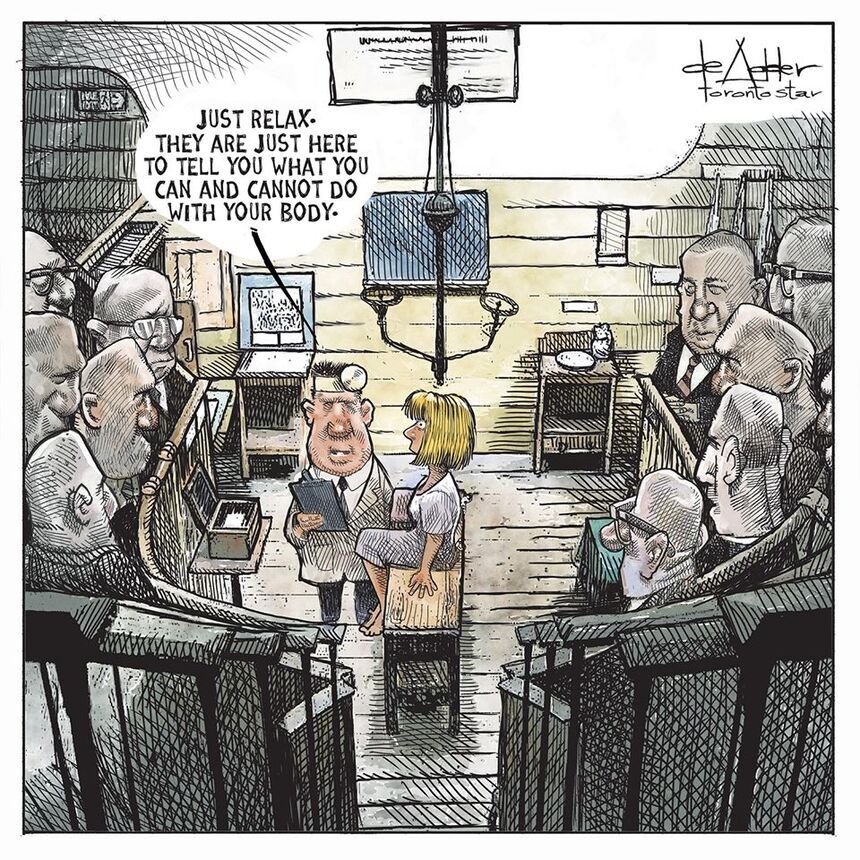 Michael de Adder also speaks directly and with only a visual exaggeration as his metaphor in addressing the utterly inappropriate, sociopathic preoccupation at the base of the movement to restrict women’s autonomy.