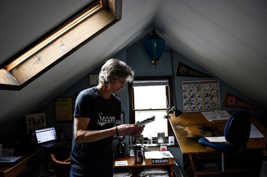Mondays, he creates his Sunday cartoon. Tuesdays and Wednesdays — his longest and busiest days — he churns out the other six cartoons for the week. Thursday through Sunday, Coverly works on his other projects. In addition to Speed Bump, he writes and illustrates children’s books; assemblies various anthologies of this work; produces cartoons for greeting cards and other merchandise, and he does illustrations for Barkbox, a monthly subscription service providing dog products and services.