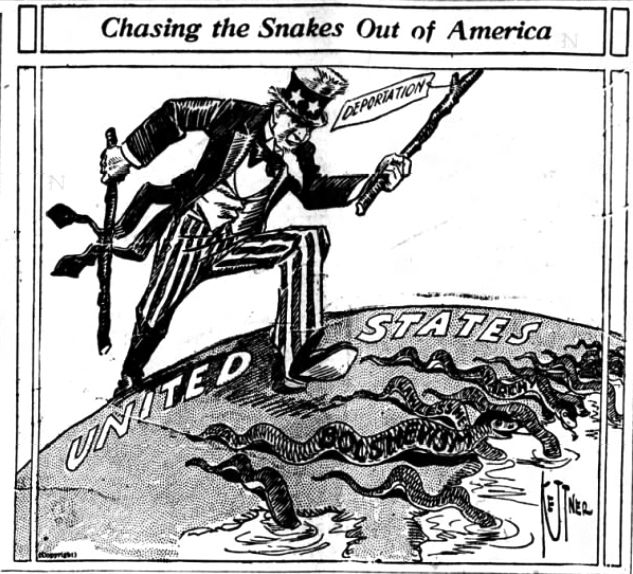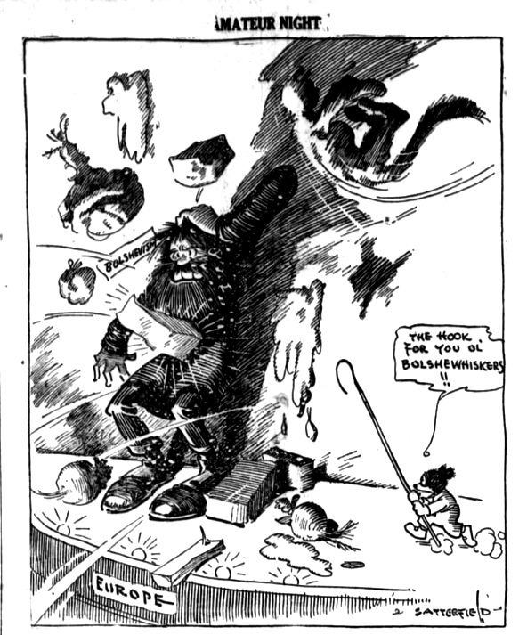 Though in a cartoon not geared for the holiday but which appeared in several newspapers that day, Satterfield notes the rise of Bolsheviks which had ended Russia’s participation in the war and was about to kick off a Red Scare in the United States.