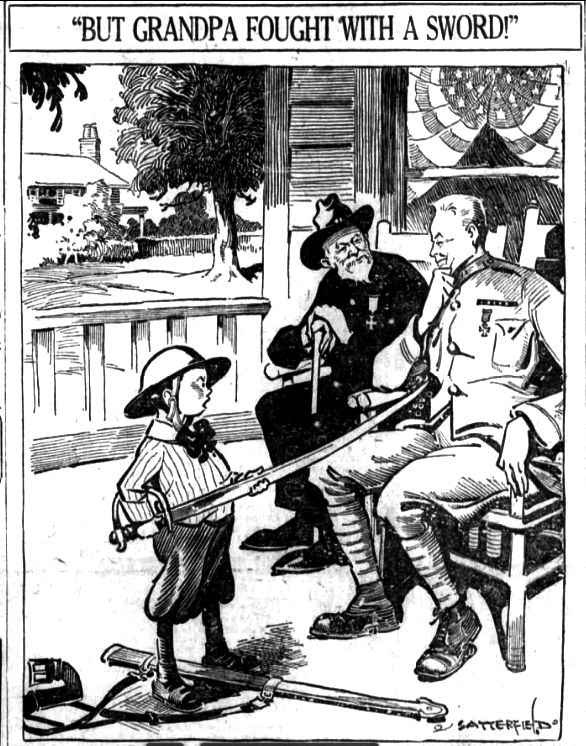 Bob Satterfield took a more whimsical look at the holiday, with veterans of the past wars chuckling over the romantic notions of a young boy. Perhaps he took seriously the idea that this had been the War to End All Wars.