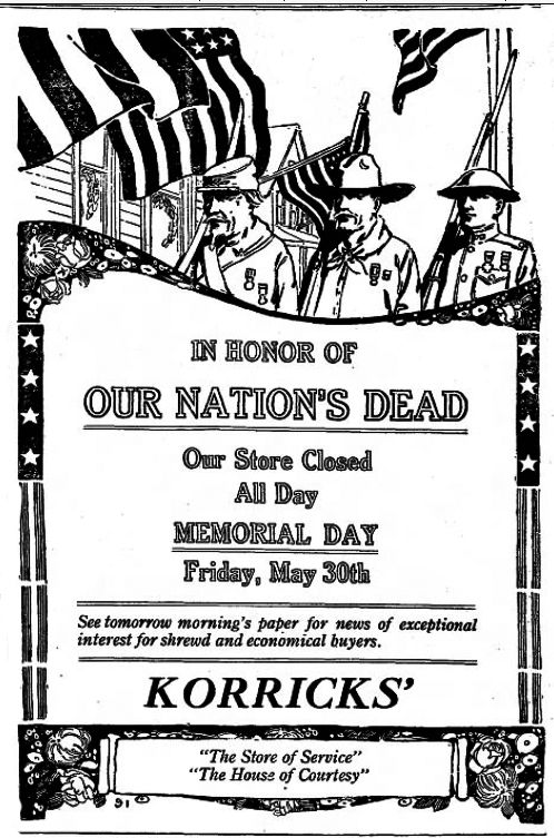 I was a little surprised at the number of papers which published on Memorial Day, until I remembered that it was not a federal holiday until 1971. We certainly took it seriously before then, but I see in the 1919 papers that there were stores that had sales, and others that took some pride in shutting their doors for the day.