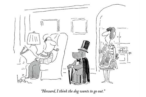 “We had a thing, where there were four of us, I don’t know if we ever mentioned this, I would get together with Sam Gross, Bill Woodman… once a month we’d all meet at Sam’s apartment, and we would sit down and we would open the phone book— we’d get the yellow pages, and then we would just blindly put our finger down. For instance we’d end up with plumbing,“Ok, we’re gonna do a plumbing gag.” We would drink afterwards. So we’d pick three topics to do cartoons on, and then we would just sit and just quickly sketch out cartoons and show each other.”