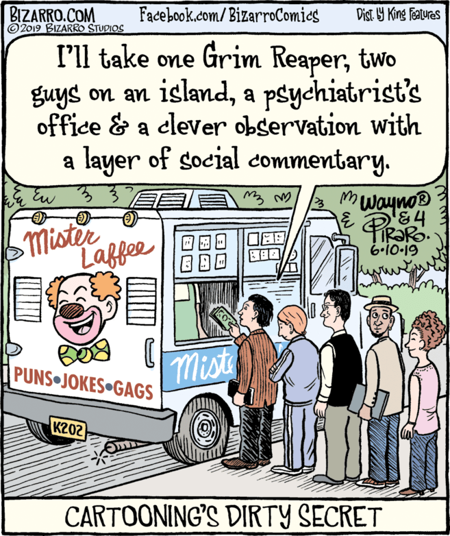 But one secret to dealing with the grind is that a lot of artists buy gags, so the Bizarro strip isn’t so far-fetched. There are a couple of strips that are all but ghostwritten, probably about as many as those in which the artist refuses to listen to other people’s ideas at all.
