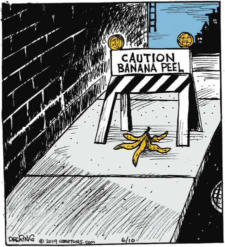 I don’t know if anyone ever actually slipped on a banana peel, and it’s a lovely example of a cliché because pratfalls are a low form of humor, though they can sometimes be worked into a gag that’s about winter weather or having too many boxes to carry or something.