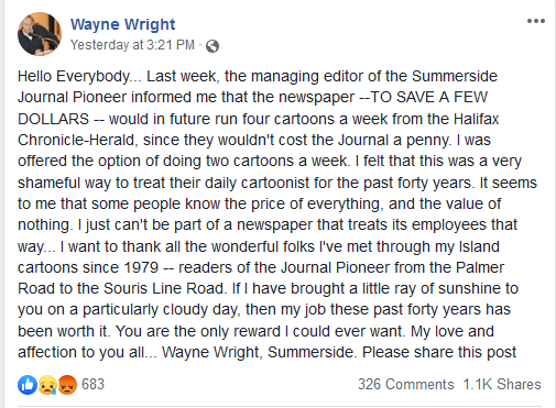 Wayne Wright has been sketching the daily cartoons for Summerside, [Prince Edward Island]-based newspaper the Journal Pioneer for the past 40 years, but last week that came to an end.