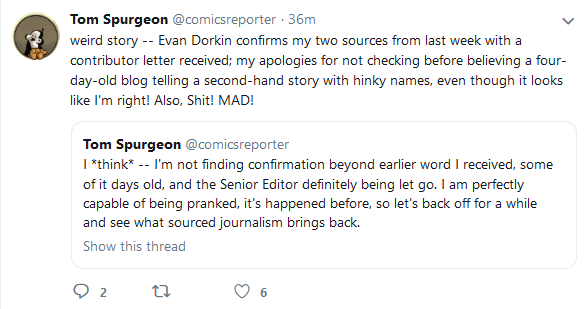 Tom Spurgeon broke the news hearing of the demise but acknowledging it was unconfirmed.