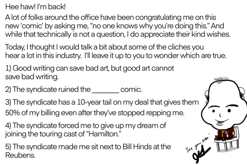* This is a parody account and all information and opinions given in this feature are for ‘entertainment’ purposes only. The views expressed and the irresponsible and immature statements made are not reflective of Andrews McMeel Universal, its Vice Chairman John Glynn, and the awful suits on the 6th floor. (Vice Chairman? Really?)