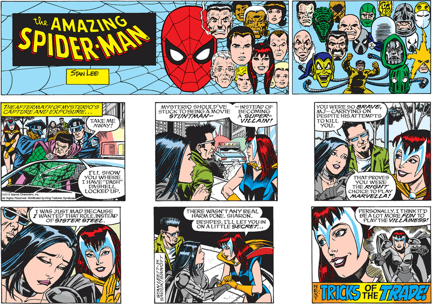 The Amazing Spider-Man catches thieves just like flies, and Mysterio has been caught. This next week will bring an end to the Mysterio reprints from 2015. Now what? If next Sunday’s Spider-man strip introduces Hobgoblin. that will mean a six month storyline putting us into 2020 before new Spider-Man stories can be expected. Next Sunday’s final panel will tell the tale.