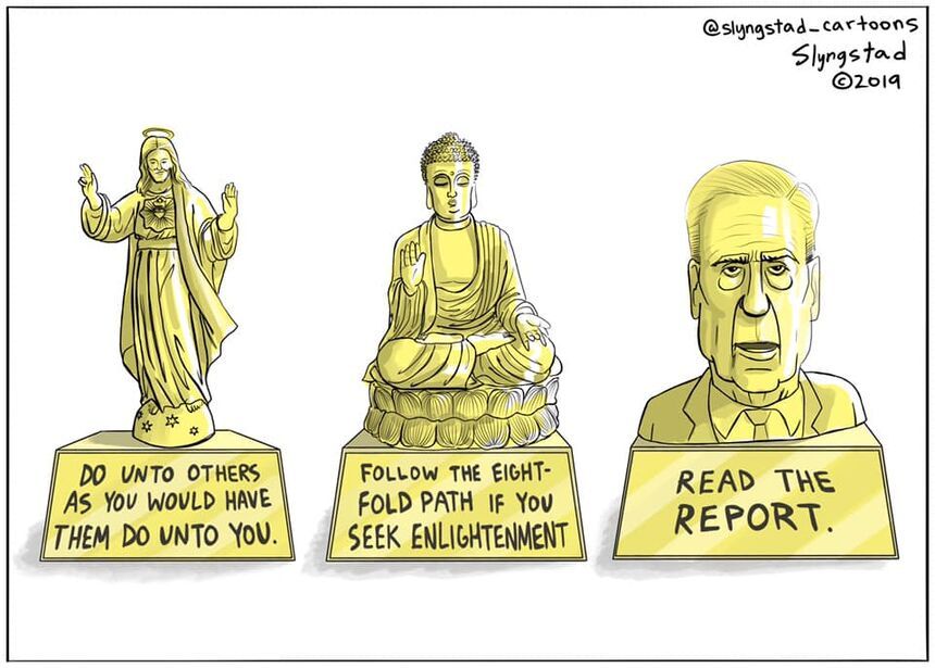 Mueller being less a rabbi and more an enlightened quizmaster, as depicted here by Brian Slyngstad, and anyone who approaches today’s hearings expecting to find the answers plainly laid out is — I predict — going to be disappointed.