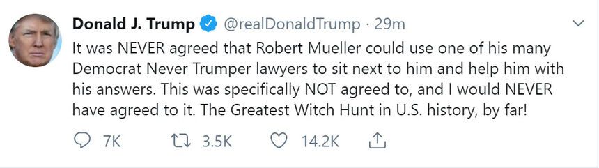 Dear Leader went ballistic on Twitter when he discovered that Mueller will have an attorney sitting next to him during the hearing. As if he’d never seen that before. Or needs his dosage adjusted.