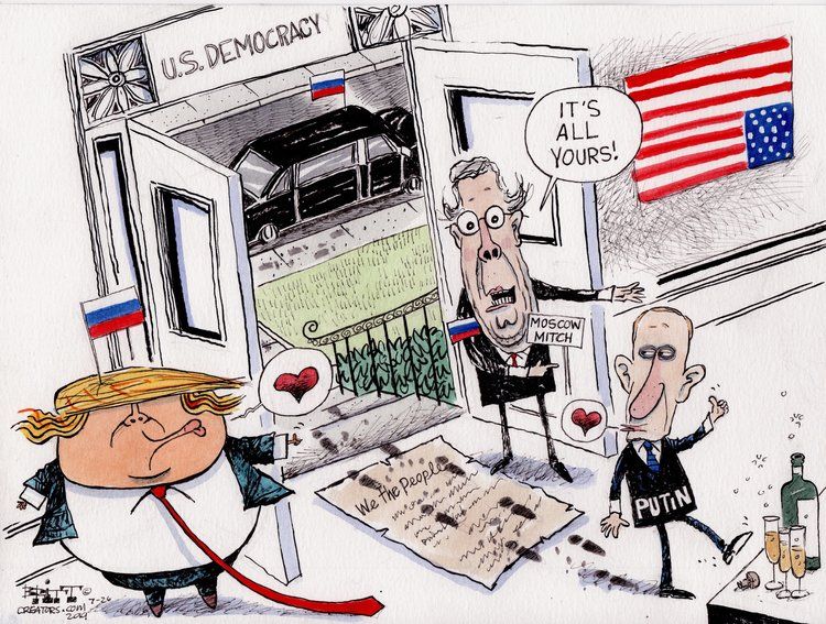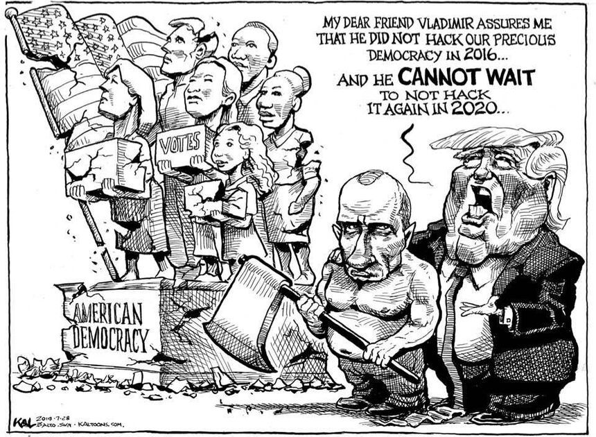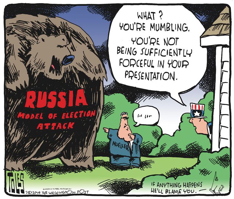 Tom Toles was paying attention and noticed that, beyond, yes, confirming the facts of that extensive report, Mueller expanded enough on his findings to warn about past efforts and continuing efforts by Russia to interfere in our elections.