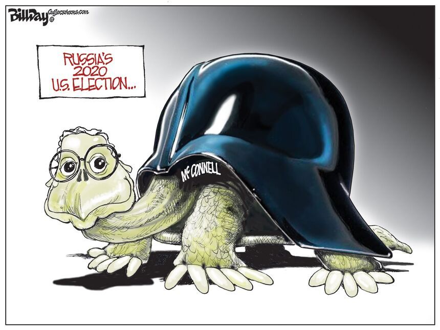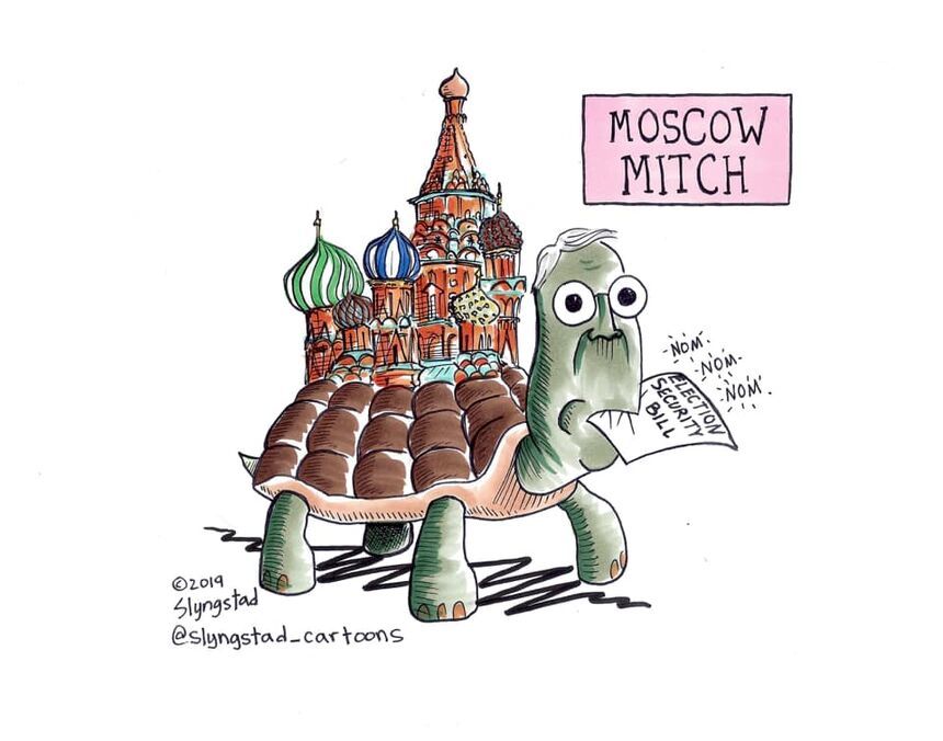 And, in this case, the turtle may be slow but he has actively moved to block legislation that would safeguard voting systems from interference, adding one more combination of political insight with targeted wiseassery: The label “Moscow Mitch.”