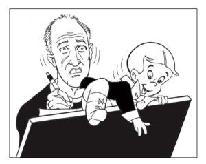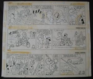 ERNIE: I was hired by Ham Fisher to ink in the backgrounds of a popular Sunday newspaper strip of the day–“Joe Palooka”. It was a great thrill and opportunity. Unfortunately, it was short-lived–Mr. Fisher committed suicide within a month. My more morbid friends attributed this tragedy to the quality of my work.