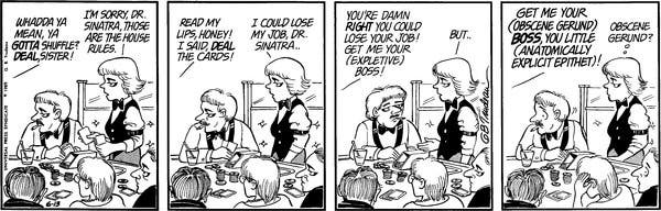 A month later, Mr. Trudeau mocked Frank Sinatra’s alleged ties to organized crime and had him, in one strip, threatening a casino blackjack dealer if she shuffled the cards before dealing. Through his lawyer, Mickey Rudin, Sinatra demanded a retraction.