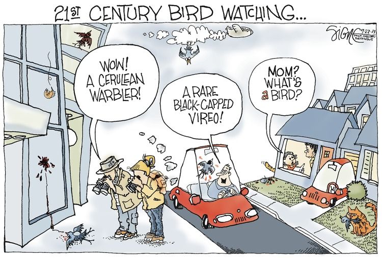 Skip to commentsSigne Wilkinson riffs on the recent report saying that our bird population has dropped by over a quarter since 1970, listing a number of ways in which birds die, though not, apparently, the Big One.