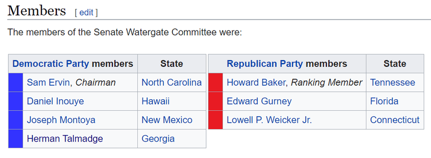 Back then, I wouldn’t have known that Baker and Weicker were Republicans or that Talmadge was a Democrat, based on watching the committee hearings.