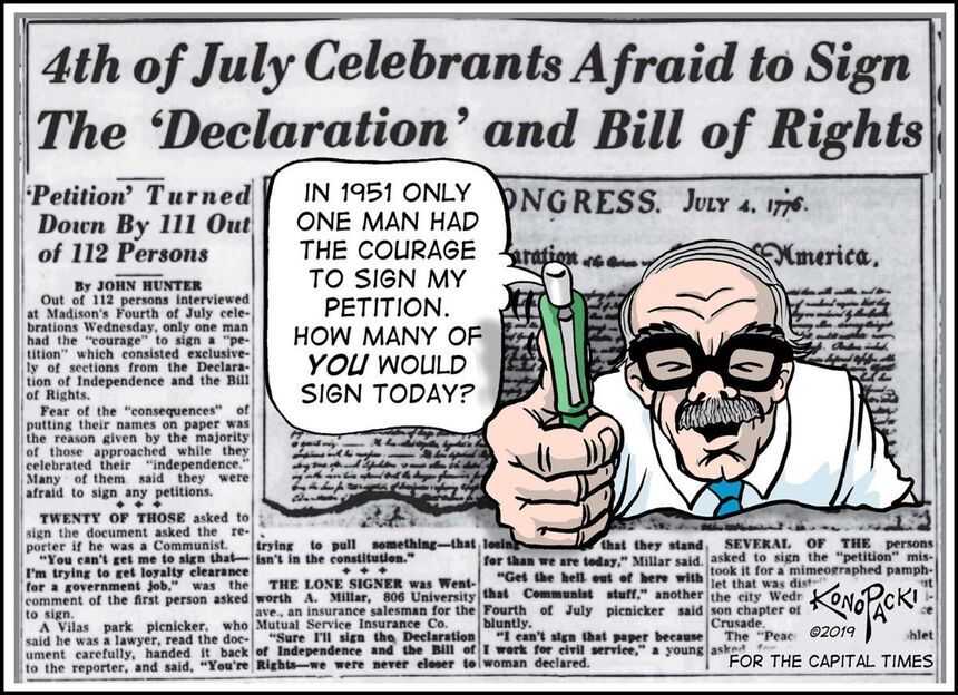 Continuing into this week (and into the foreseeable future?) is the Mike Konopacki illustration/cartoon that regularly accompanies the column by editor emeritus Dave Zweifel. There is an archive of Mike’s Cap Times work.