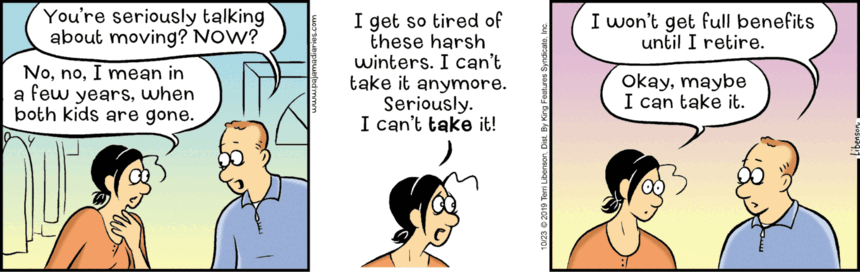 As the conversation continues — this is today’s strip — it develops that the reason snowbirds can do that is that (1) they’re retired and (2) they bought that second house back before real estate prices went nuts.