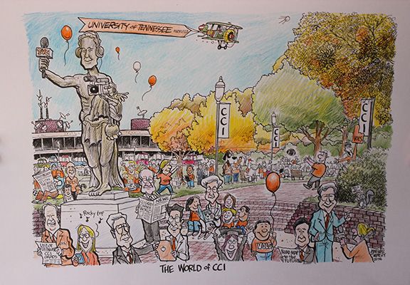In 2014, he drew an original cartoon for the College of Communication and Information and presented it to the CCI Board of Visitors. That cartoon depicted all of the college’s deans over the years, including his beloved Faye Julian.