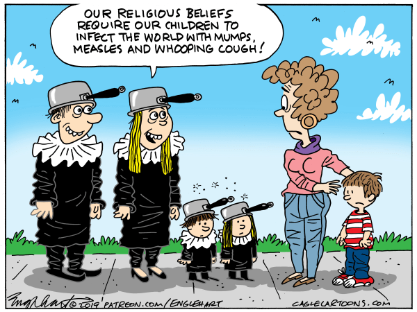 An editorial cartoon posted Oct. 24 on Recordonline.com, depicts a family in religious-like clothing with pots on their heads, in which the mother says to a mother that reaches for her son, “Our religious beliefs require the children to infect the world with mumps, measles and whooping cough.” To me, that is inflammatory because some people may take it to mean that anyone whose practiced religious beliefs are not the same as theirs should be regarded with caution in the least and hated at most…