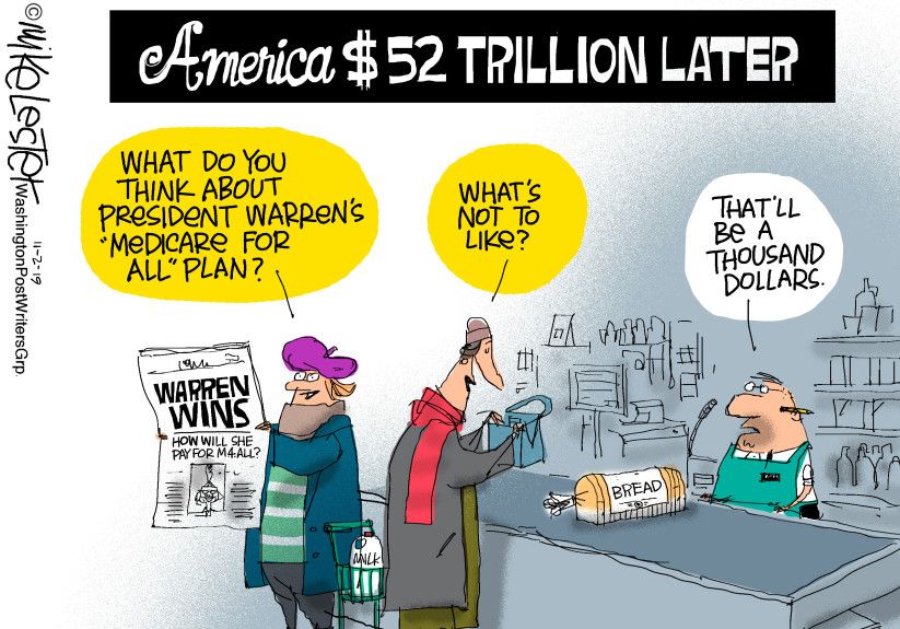 Wednesday’s editorial cartoon suggests that if we implement Medicare for all, a loaf of bread will cost $1,000.