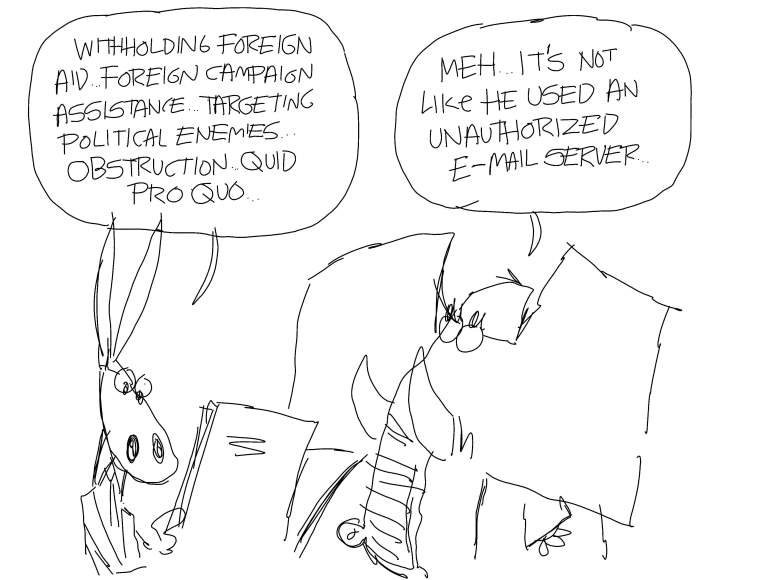 Of course, some cartoonists habitually work hard and file often, and Clay Jones has posted a dozen-and-a-half sketches of things that recently came to him and went undeveloped, not all of which are impeachment-based.