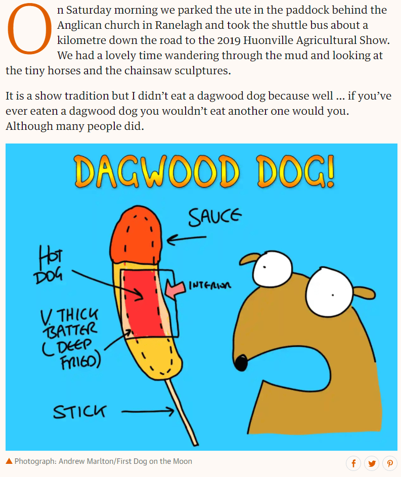However, those aren’t the dogs that got my attention, because I wondered if a “Dagwood Dog” and a “Corn Dog” were the same thing and research showed they are, but research also showed that at least some Aussie slang is as impenetrable to them as it is to us.