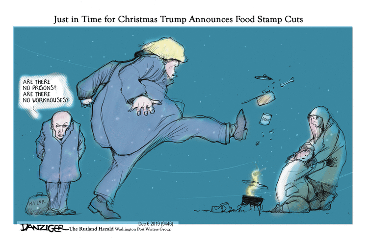 Matt Davies doesn’t reference Dickens, but his more direct criticism of the heartless bureaucracy does suggest the difference between Ebenezer Scrooge and the current crowd of misers.