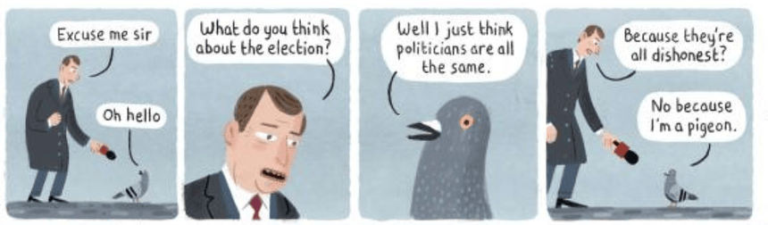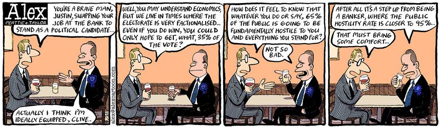 Alex is running for Parliament, and his creators have taken a moment to go back and remember 30-plus years of election humor. You often have to know a lot about British banking regulations to get a laugh from Alex, but this is all very accessible, funny humor.