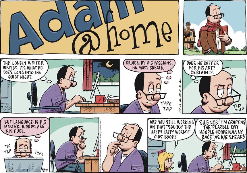That artistic theme continues in today’s Adam@Home. One of the pillars of the strip is Adam’s mediocrity, but Rob Harrell adds a bit of bite this morning because he has written a successful children’s book and not every cartoonist who has turned his hand to kid’s books has been able to add that je ne sais quoi that makes it matter.