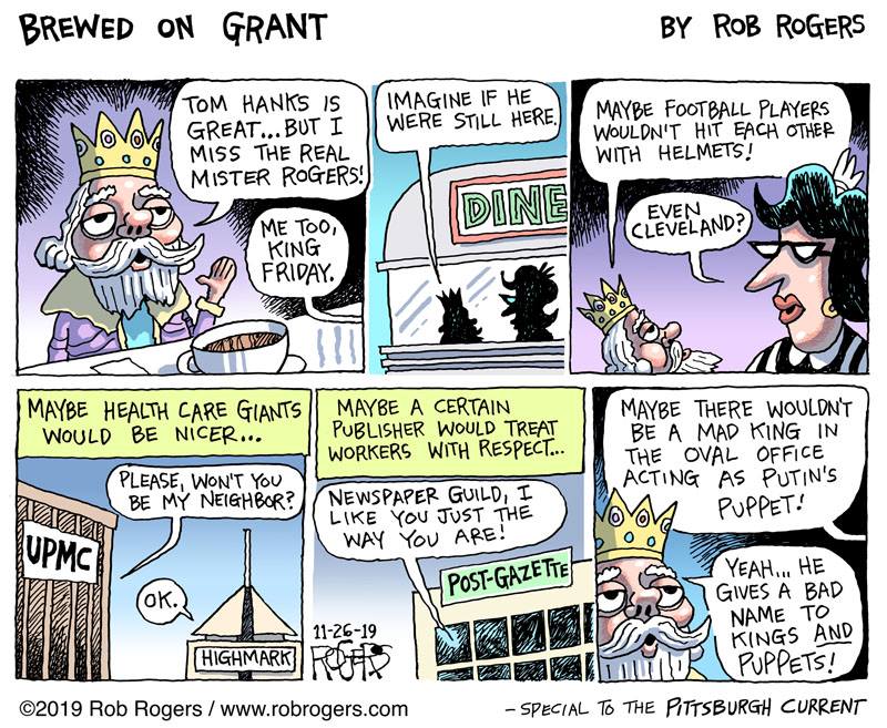 The good news is that Rob Rogers has found a home for “Brewed on Grant,” his local look into Pittsburgh life. The other good news is that he manages to combine the personal with the universal, which is the key to good writing.