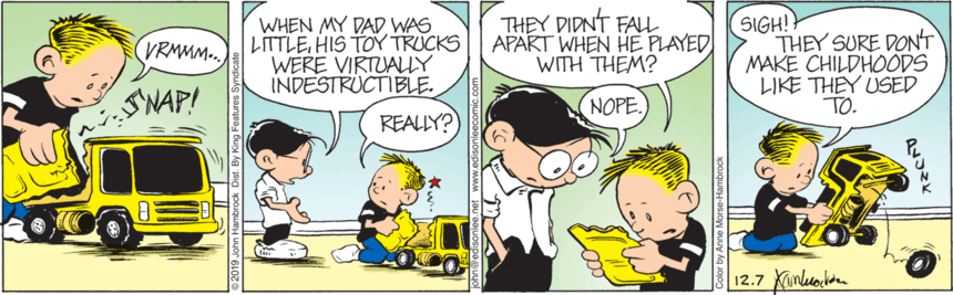 Another generational issue came up this past week in Edison Lee, and I tend to concur: We broke our toys doing ridiculous things or by simply leaving them out in the weather, but they were sturdy.