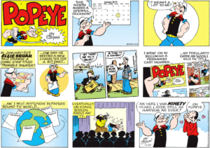 Olive’s brother Castor Oyl eventually became the leading man, with Olive and Hamgravy continuing as co-stars. The strip was a middling hit – enough to warrant a Sunday page that began January 25, 1925.